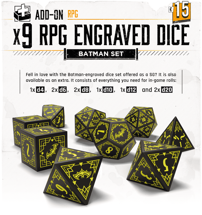 Apaixone-se pelo conjunto de dados gravados pelo Batman. Ele consiste em tudo o que você precisa para rolagens no jogo: 1xd4; 2xd6; 2xd8; 1xd10; 1xd12; 2xd20.