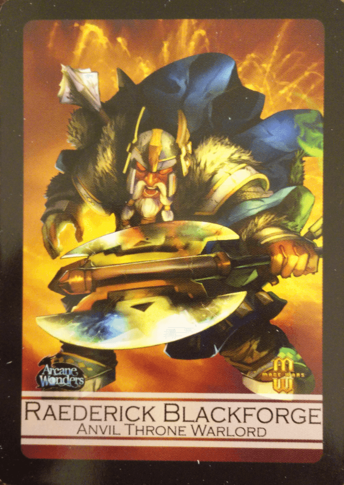 Um personagem promocional cruzado do jogo Mage Wars da Arcane Wonders, o Raederick Blackforge é um lutador pesado com quatro cartas de equipamento únicas que ele pode forjar para si mesmo enquanto a partida continua. Essas peças de equipamento, uma vez feitas, concedem bônus permanentes da Raederick para o resto da partida e podem ser sacrificadas para lhe dar grandes bônus temporários. Com a ajuda de seus braços e armaduras, Raederick pode transformar-se em um verdadeiro rival.