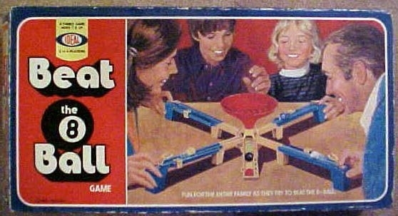 O jogo Beat The Eight Ball da Ideal é um jogo de paciência e habilidade. Depois que a Bola Oito é colocada girando no funil, cada jogador deve decidir quando lançar sua própria bola de gude. Vencer a Bola Oito dá pontos, entrar depois de tirar pontos. Mais pontos são dados quanto mais tarde sua bola estiver, então vale a pena arriscar.