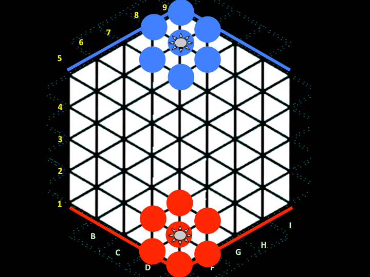 Os jogadores começam com um rei em seu ponto de partida em cantos opostos da grade hexagonal. Os jogadores preenchem sua zona, que inclui todos os pontos adjacentes ao ponto de partida, com homens. Os homens são definidos como um verificador ou pilha de damas. Por padrão, os homens começam com um tamanho de pilha de 1 verificador. Os homens se movem em qualquer direção em linha reta, com distância até o tamanho da pilha ou subpilha em movimento. As pilhas saltam sobre os pontos ocupados, mas não podem se mover ou pular sobre os blocos. As capturas acontecem por substituição (como no xadrez). A captura não depende do tamanho da pilha (pequenas pilhas podem capturar grandes pilhas e vice-versa). Novos homens podem ser criados mesclando e dividindo pilhas (definidas abaixo). Por padrão, os homens estão limitados a fazer pilhas não superiores a duas damas. Para criar pilhas com mais de duas damas, pelo menos uma delas deve ser abençoada, interagindo com as paredes inimigas.