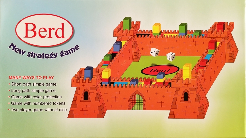 O tabuleiro do jogo Berd tem a forma de um castelo quadrado visto de cima. Na verdade, os quadrados de canto inicial/final foram projetados maiores para acomodar quatro pilhas de fichas.
