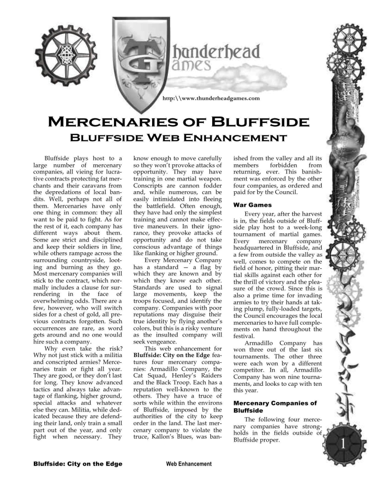 Bluffside abriga um grande número de empresas mercenárias, todas competindo por contratos lucrativos que protegem os comerciantes gordos e suas caravanas das depredações dos bandidos locais. Bem, talvez nem todos eles. Os mercenários têm apenas uma coisa em comum: todos querem ser pagos para lutar. Quanto ao resto, cada empresa tem maneiras diferentes de lidar com isso. Alguns são rigorosos e disciplinados e mantêm os seus soldados na linha, enquanto outros atacam a zona rural circundante, saqueando e queimando à medida que avançam. A maioria das empresas mercenárias cumprirá o contrato, que normalmente inclui uma cláusula de rendição diante de adversidades esmagadoras. Há alguns, no entanto, que trocarão de lado por um baú de ouro, todos os contratos anteriores esquecidos. Tais ocorrências são raras, pois a notícia se espalha e ninguém contrataria tal empresa.