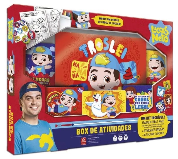 Com mini jogos, o Box de Atividades Luccas Neto inclui cartas holográficas, lâminas com atividades variadas, uma caixa de giz de cera , uma cartela de adesivos e um boneco para montar do Luccas Neto.