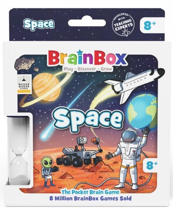 BrainBox Espaço contém 25 cartas de jogo ilustradas à mão, ricas em detalhes, para aprender sobre o universo, a história da exploração espacial e, quem sabe... alienígenas! O formato portátil permite que o jogo seja aproveitado em casa ou durante viagens.