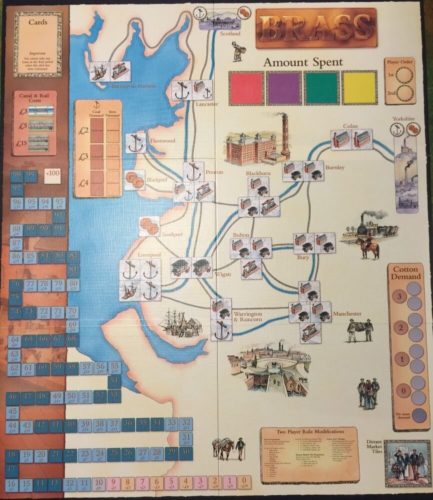 Descrição: Este tabuleiro de jogo de dupla face permite que aqueles que possuem versões de Brass anteriores à edição Deluxe joguem a variante para 2 jogadores.