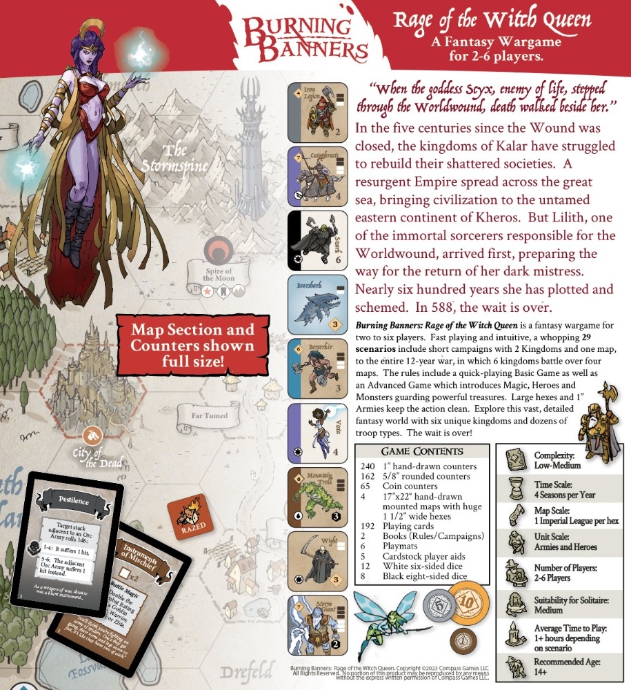 Burning Banners: Rage of the Witch Queen é um jogo de guerra de fantasia para dois a seis jogadores. Jogo rápido e intuitivo, 29 cenários impressionantes variam de campanhas curtas com 2 reinos e um mapa, a toda a guerra de 12 anos, na qual 6 reinos batalham em quatro mapas. As regras incluem um Jogo Básico de jogo rápido, bem como um Jogo Avançado que apresenta Magia, Heróis e Monstros que guardam tesouros poderosos.
