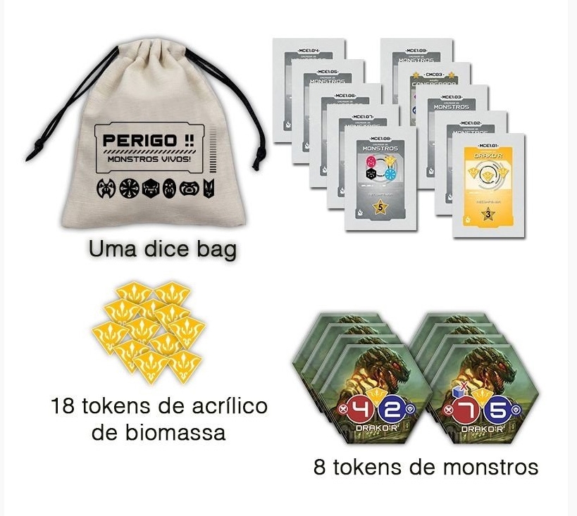 Kit de Monstros contendo 1 dice bag, 10 cartas de missão para a nova raça, 18 tokens de acrílico de biomassa e 8 tokens de monstro para o jogo Caçadores da Galáxia.