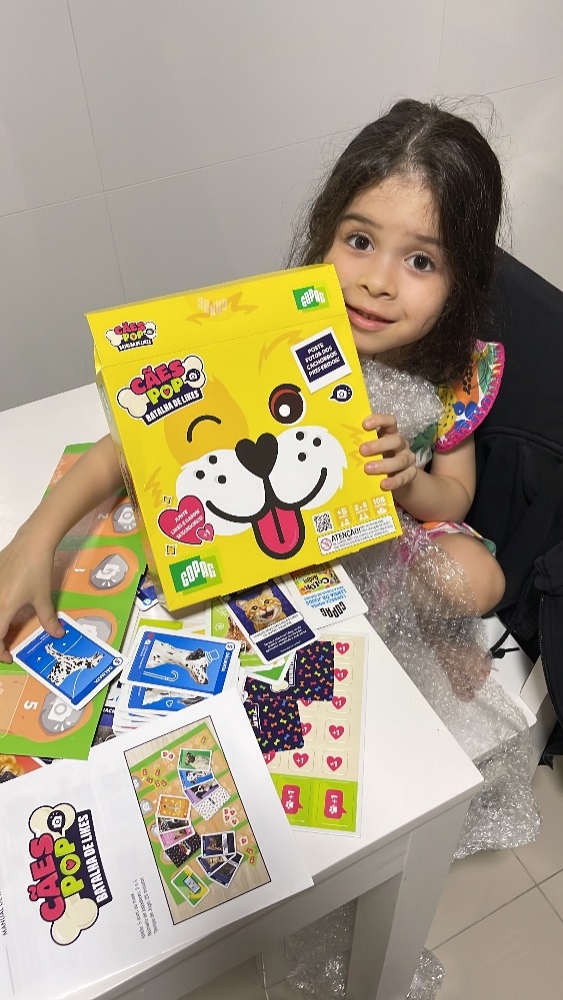 - 1 baralho de 105 cartas contendo: 70 Cartas de Foto, 24 Cartas de Comentário, 10 Cartas de Cães POP, 1 Carta de Close