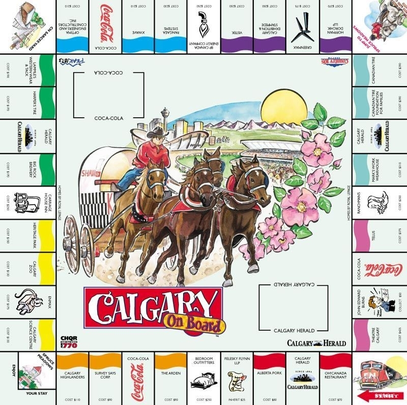 Calgary On Board é um clone do Banco Imobiliário baseado na cidade da província de Alberta, no Canadá. Os quadrados do tabuleiro são substituídos por marcos e empresas da área. A renda do jogo vai para o Theatre Calgary e a Calgary Stampede Foundation.