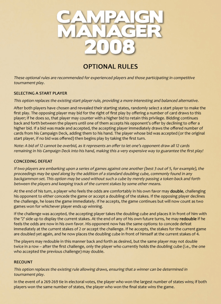 Campaign Manager 2008 desafia os jogadores a criar uma estratégia política vitoriosa dentro do tumultuado contexto da campanha presidencial norte-americana de 2008. Empregando uma nova visão em sistemas direcionados por cartas, cada jogador irá criar um baralho único que representa seus conselheiros para o seu candidato. Os jogadores vão lutar para influenciar eleitores em estados críticos, enquanto miram projetos que podem colocá-los acima do adversário. Jogadores irão tentar definir os problemas chave de cada estado. Será que McCain vai dominar o debate de segurança nacional, ou pode Obama usar os temores dos rumos econômicos? Como gerente de campanha a presidente, você irá identificar ou o caminho para a Casa Branca, ou o caminho para a irrelevância.