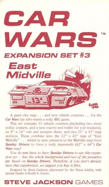 "Um mapa da cidade gigante e novos contadores de veículos, para o fã de Car Wars que quer um jogo realmente grande. Este conjunto contém 31 contadores de veículos... mapa de polegadas de East Midville, que por sua vez se conecta ao mapa de Midville do Sunday Drivers para formar um mapa verdadeiramente gigantesco (42x64 polegadas) de Car Wars!"