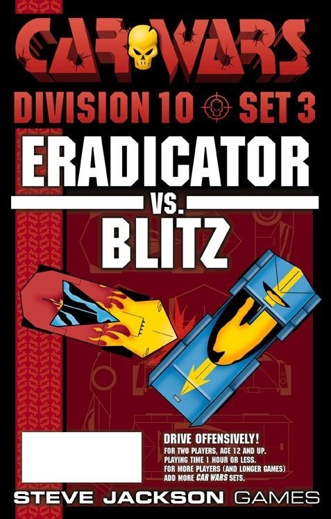 Car Wars Fifth Edition Starter Set, Division 10 - Set 3 é um conjunto inicial completo para Car Wars: as regras básicas, contadores e componentes e dois carros. Os carros são Eradicator vs. Blitz (cada um tem modificações). Os duelos da Divisão 10 permitem um total de $ 10.000 para um veículo. A chave giratória Car Wars incluída no conjunto é especialmente útil.