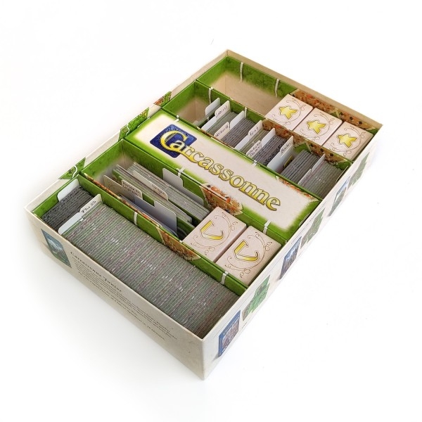 Com esta paisagem inicial e seus 15 suportes para peças você pode armazenar suas peças das mini expansões de Carcassonne de maneira ordenada. Você pode usar os 15 suportes para ladrilhos individualmente como divisórias e remover cada suporte para ladrilhos com seus ladrilhos individualmente.