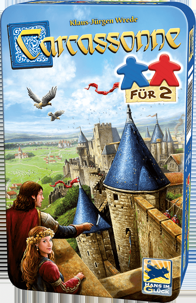 Carcassonne für 2 é uma versão de dois jogadores para Carcassonne que vem em uma caixa de metal e contém 48 tiles e 12 meeples.