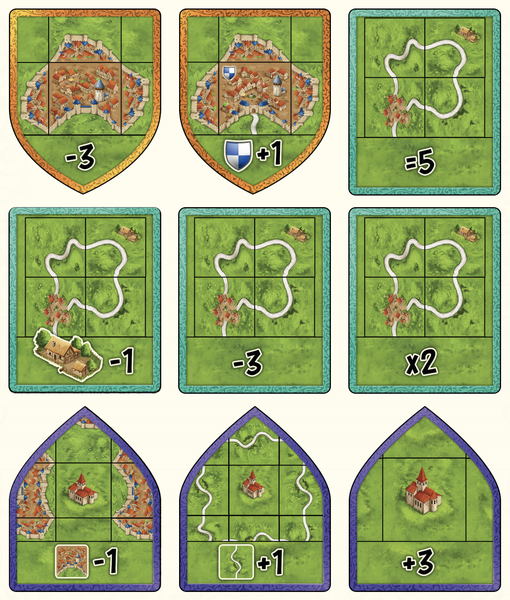 Você criará uma pilha de tiles de topografia para cada uma das três estrutura de paisagem: estradas, cidades e mosteiros. Nessas pilhas um tile de cada estrutura permanece ativo e um segundo aberto sendo o próximo da fila. Quando pelo menos um estrutura marca pontos para qualquer jogador, você pontua conforme todos os tiles ativos e então, coloca os tiles pontuados no fundo de suas respectivas pilhas e transformando os tiles seguinte em ativos. Alguns tiles dão bônus, outras penalidades.