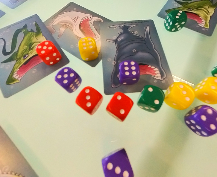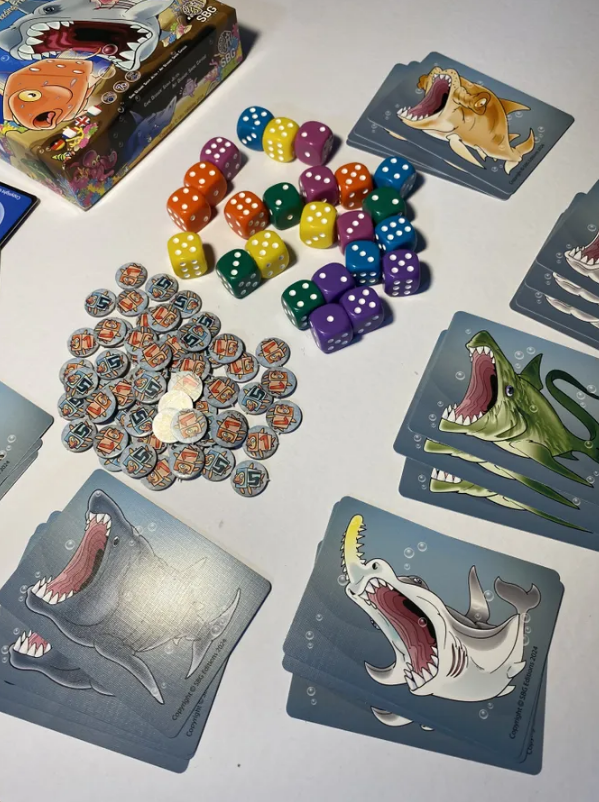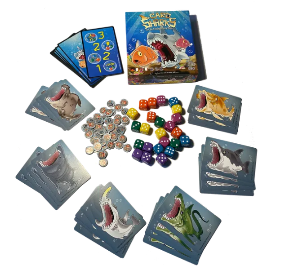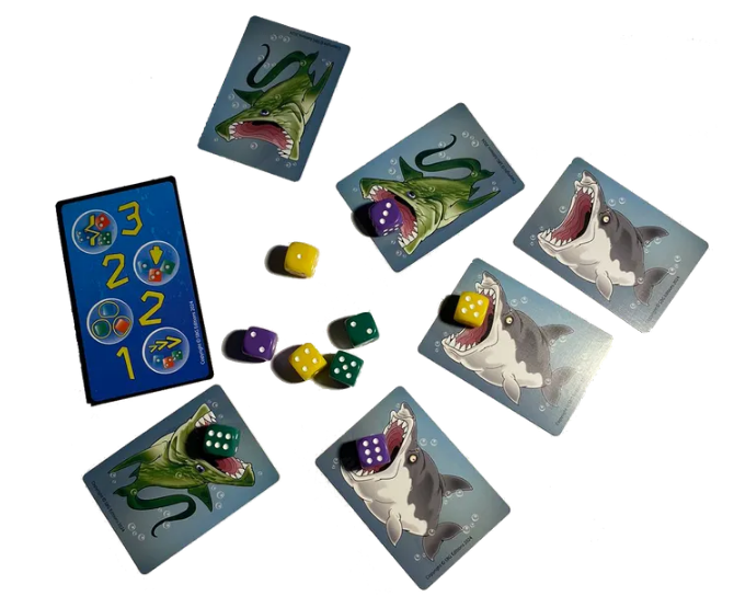 Card Sharks é um jogo maluco, acelerado e em tempo real, no qual cada jogador usa suas 3 cartas de tubarão para devorar os peixes mais saborosos e valiosos representados por dados, com base em uma série de cartas de Condição de Pontuação sorteadas aleatoriamente.