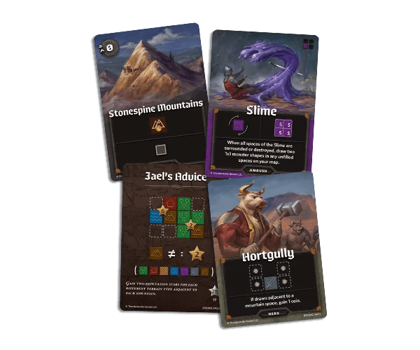 Quatro novas cartas que adicionam mais variedade aos seus jogos de Cartógrafos e Cartógrafos: Heróis. Todas as cartas têm ligações temáticas com o jogo Stonespine Architects.