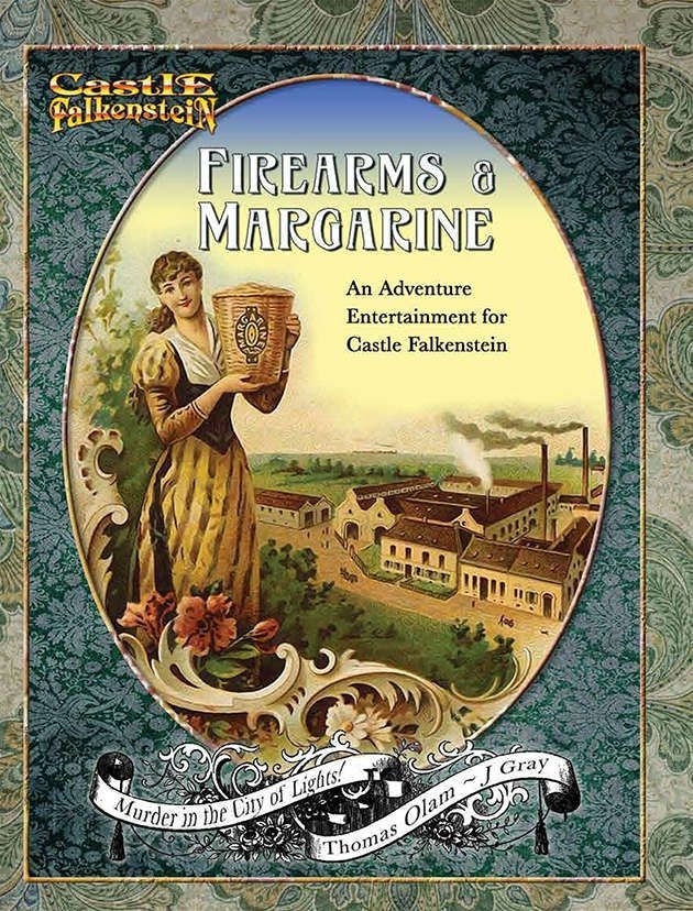 Firearms & Margarine é um entretenimento de aventura na forma de um mistério e adequado para qualquer jogo Castle Falkenstein. Também está incluída uma nova subespécie de Brownie, conhecida como Teuz, que é nativa da França e personagens dramáticos pré-criados para aqueles anfitriões que desejam pular a criação de personagens e passar para a solução do mistério.