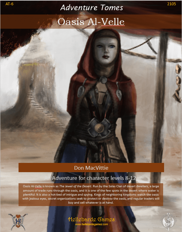 Tudo o que o viajante cansado pode precisar pode ser encontrado no Oasis Al-Velle. Uma localização central no deserto, o Oasis também atua como um importante centro comercial entre o deserto e as terras mais férteis além. Mas há aqueles que querem usar o Oasis para seus próprios propósitos, ou assumir o controle completo dele - e de toda a água e comércio que ele possui.