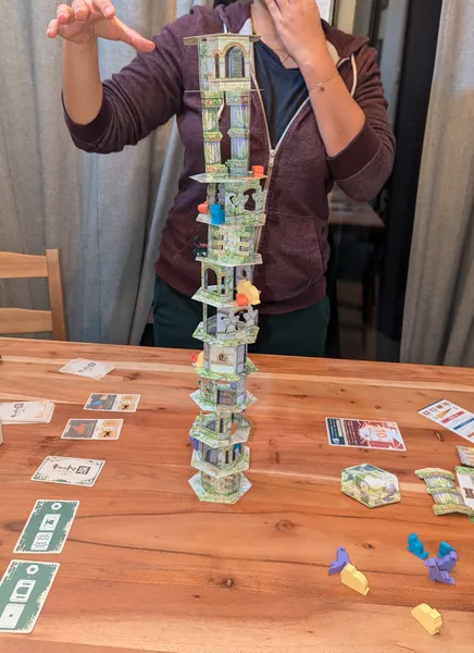 A cada turno, você escolherá opções entre as cartas disponíveis para construir a torre cada vez mais alta ou testar o quão firme você consegue manter sua mão realizando desafios de destreza que ajudarão Toto a subir mais alto até seu destino.