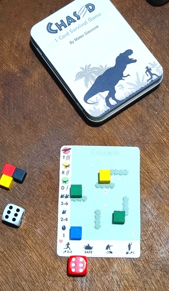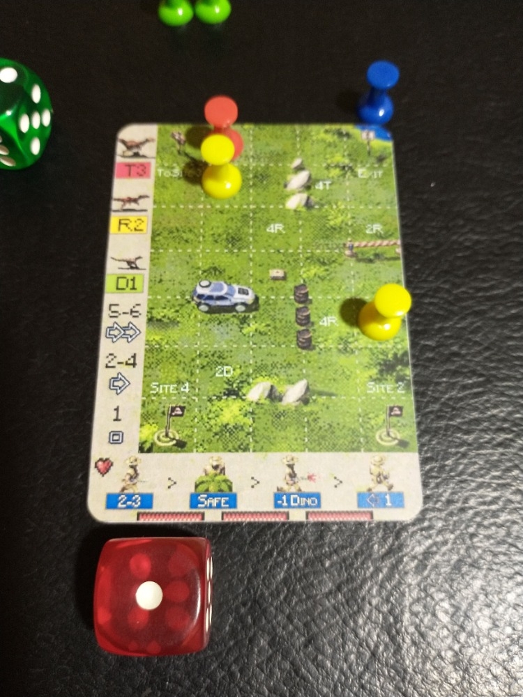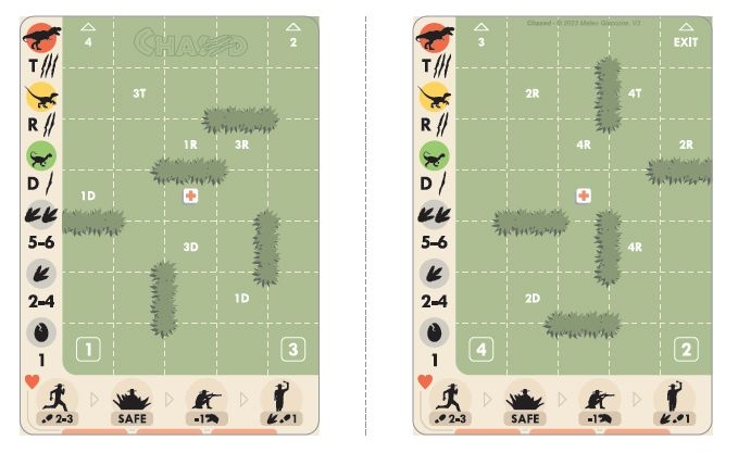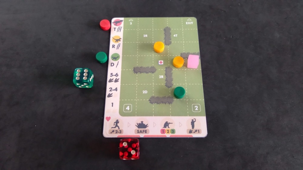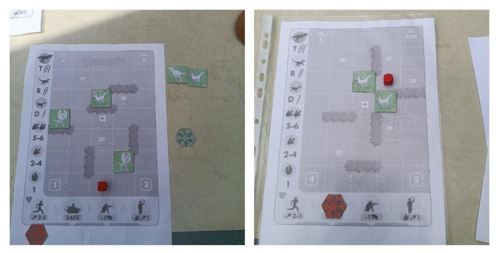A cada turno, você tem 2 ações diferentes para realizar com seu personagem. Em seguida, é a vez dos dinossauros, que irão atrás de você — se conseguirem ficar adjacentes ao seu personagem, você receberá dano.
