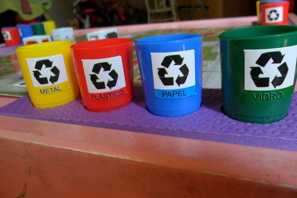 16 latões de lixo de plástico colorido : Amarelo=Metal ; Vermelho=Plastico; Verde=Vidro ; Azul=Papel