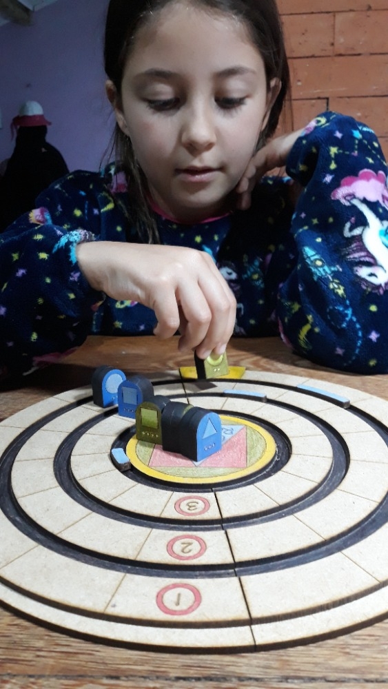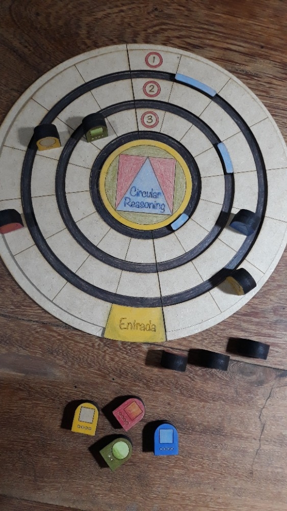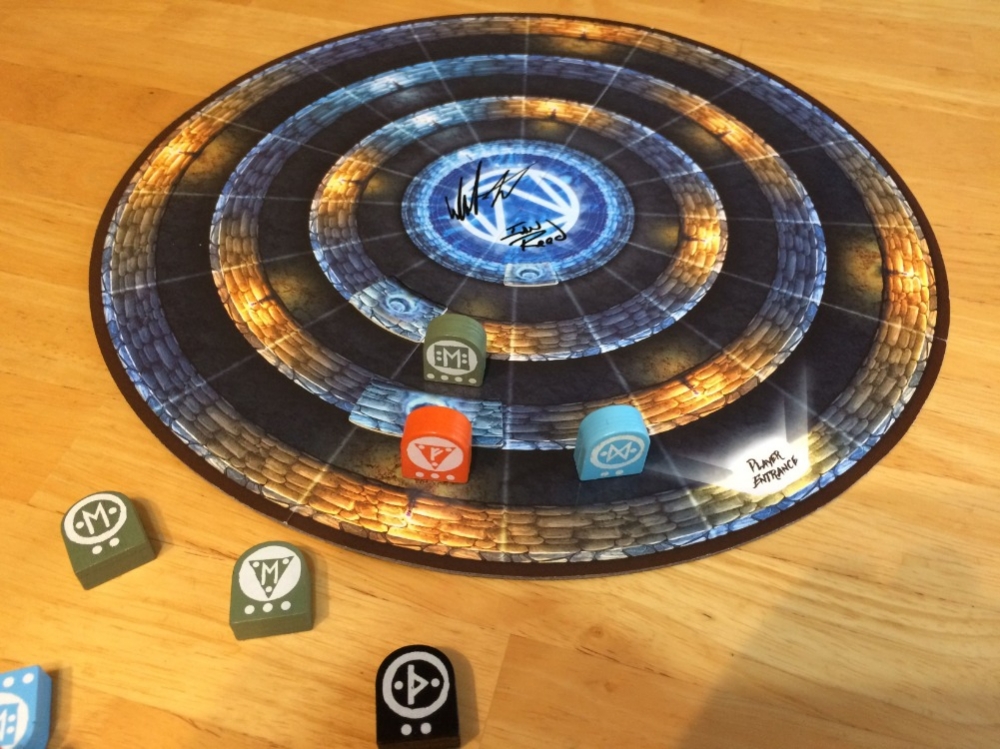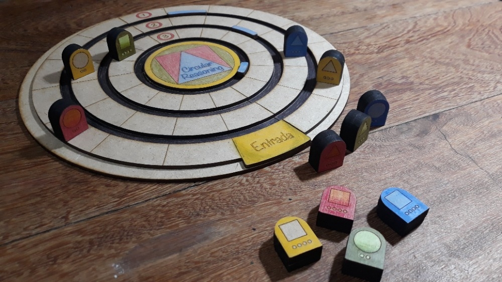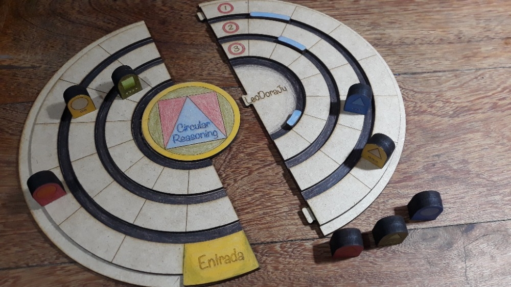 O tabuleiro é composto por um "gol" no centro e três faixas concêntricas de 16 lugares cada. Cada faixa tem um portão para o próximo nível , mas os portões giram em torno do tabuleiro de acordo com o número de fichas encontradas em cada nível. Cada jogador recebe um quadrado, um triângulo e um círculo, que se movem quatro, três ou dois lugares, respectivamente. Além disso na corrida em direção ao centro, peças podem ser utilizadas para bloquear outras de avançar. Devido a isso, os jogadores devem planejar bem sua jogada.