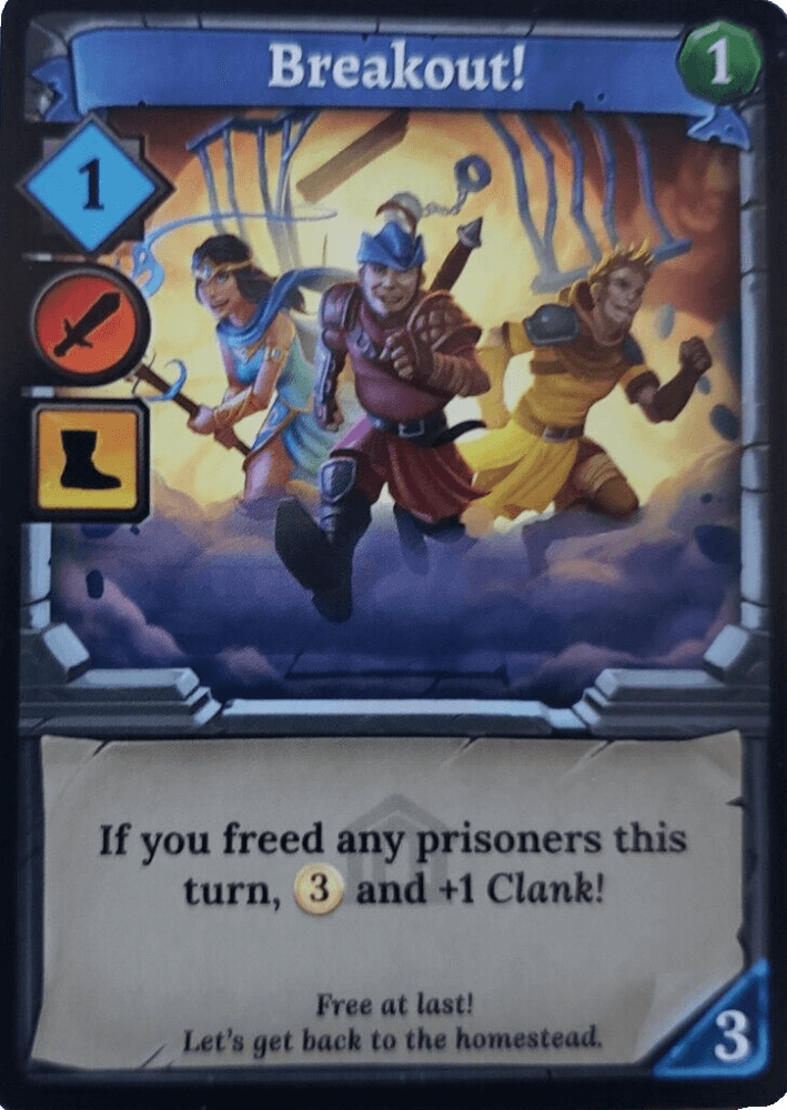 Efeito: 1 Habilidade, 1 Espada, 1 Bota, Se você libertou algum prisioneiro neste turno, 3 Ouro e +1 Clank!