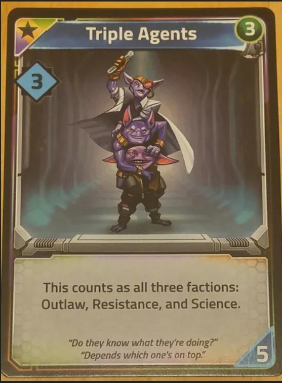 Clank! In! Space! Triple Agents é uma carta promocional para Clank! In! Space! que conta como todas as três facções: Outlaw, Resistance e Science.