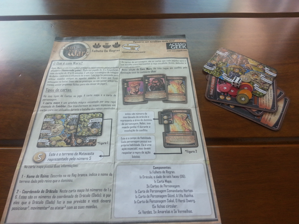 Coin Wars é um micro jogo para 2 a 3 jogadores, com duração de 10 à 15 minutos. É um jogo estratégico de rolagem de dados, controle e influência de áreas, personagens com habilidades e o sistema de pontos de ação.
