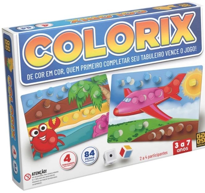 Colorix é um jogo com regras simples que não exige estratégia para vencer, possibilitando que crianças mais novas joguem com pessoas de faixas etárias maiores. Além de ser muito divertido, sem perceber, elas vão se familiarizando com os números e as cores. São 3 formas diferentes de jogar e o objetivo é preencher os espaços das imagens com as fichas coloridas correspondentes. Quem primeiro completar seu tabuleiro vence o jogo!