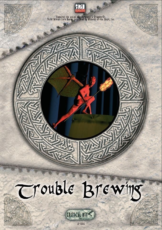 O cenário de Trouble Brewing é um edifício solitário capaz de se teletransportar, então o encontro pode ser localizado em qualquer terreno que você achar adequado. A curiosidade por si só deve garantir que os jogadores não optem apenas por contornar o edifício peculiar. Quando o encontro começa, os PJs estão no meio de uma jornada ou de outra. Como heróis, eles estão em constante movimento, então Trouble Brewing pode ser inserido em qualquer uma de suas viagens. Onde quer que estejam, deve ser uma área relativamente isolada, para que a presença de um edifício bem cuidado pareça incomum.
