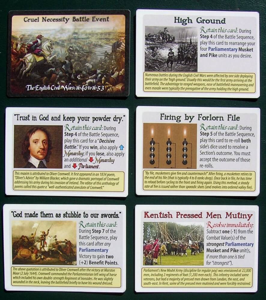 Cada uma das três guerras civis inglesas são reproduzidas através do uso de baralhos de cartas separadas que recriam os acontecimentos políticos e militares históricos que poderia significar a ruína para as forças parlamentares. Há guerras civis em curso não apenas na Inglaterra, mas na Escócia e Irlanda também, e cada uma terá impacto variado sobre o jogo em momentos diferentes.