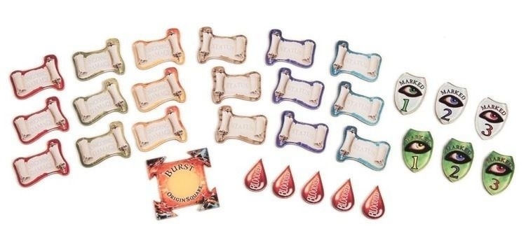 O conjunto de Expansão de Pergaminhos contém mais fichas de pergaminho em branco inteligentes que permitem que você, com o uso de um marcador de apagamento úmido, rastreie condições únicas e danos contínuos em seus combates. Existem 9 pergaminhos de Dano Contínuo e 9 Pergaminhos de Status, cada um moldado para que possam descansar contra a base das miniaturas, ou podem ser colocados em fichas de personagens e cartas de monstros correspondentes. O conjunto também contém 2 conjuntos de fichas Marcadas de cores diferentes para os combatentes que se concentraram em seus alvos. Completando o conjunto estão mais 5 tokens Bloodied e o novo token Burst Origin para um total de 30 tokens!