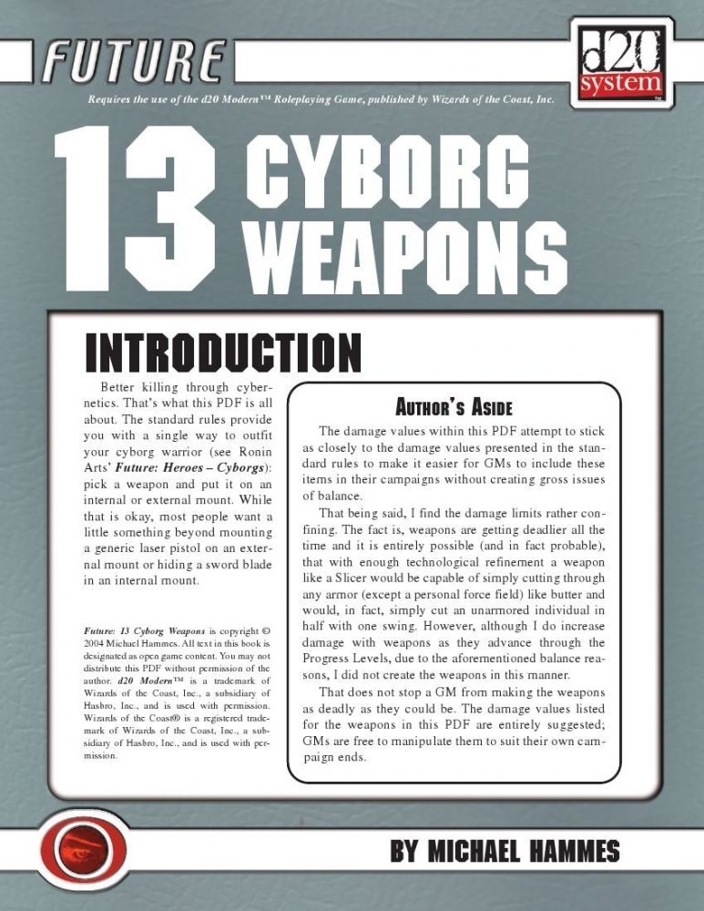 Neste PDF de 9 páginas, o autor Michael Hammes apresenta 13 armas originais para uso com montagens de armas externas e internas. Da fritadeira ao freezer, do lançador de foguetes ao choque e da anaconda ao fatiador, este PDF fornece aos personagens aprimorados ciberneticamente novas opções de combate.