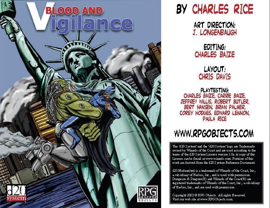 Blood and Vigilance fornece tudo o que você precisa para trazer as quatro cores BAM e POW dos quadrinhos para suas aventuras do Modern d20.