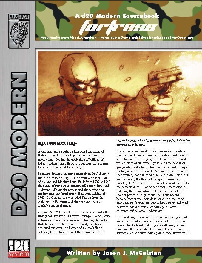 Um livro de referência para d20 Modern e Haven: City of Violence d20 Modern. Qualquer soldado que se preze lhe dirá que qualquer capa é melhor do que nenhuma capa. É por esta razão que os edifícios fortificados ainda são projetados e construídos, e que as estruturas mais antigas são adaptadas e reforçadas para resistir melhor à guerra moderna. A intenção deste livro é dar aos jogadores e mestres uma compreensão completa dos usos das fortificações modernas, sua construção e como atacar, defender, superar ou reduzi-las em seus jogos.