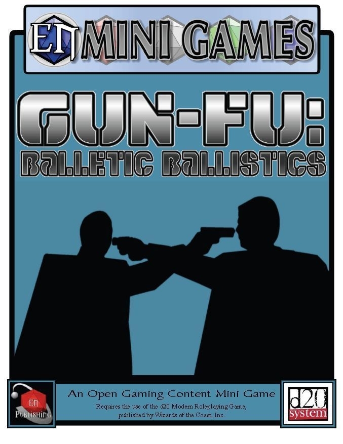 O primeiro produto da nova linha de minijogos da EN Publishing, Gun-Fu usa as regras do Modern d20 como ponto de partida, mas apresenta um sistema de classes totalmente novo, um sistema de pontos de vida completamente diferente e regras de armas de fogo renovadas para criar um estilo cinematográfico distinto. estilo de jogo que favorece a ação selvagem em detrimento de manobras cuidadosas. Os personagens têm uma pontuação de Panache que os permite realizar acrobacias malucas, mas quando esgotada os deixa vulneráveis a seus Defeitos fatais. Os jogadores assumem o papel de policiais dedicados, membros ambiciosos da Tríade ou apenas pessoas envolvidas na violência.
