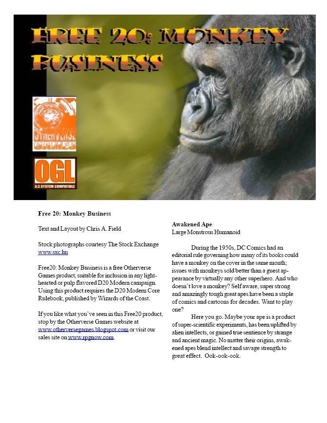 Free20: Monkey Business é um produto Otherverse Games gratuito, adequado para inclusão em qualquer campanha D20 Modern alegre ou com sabor de polpa.