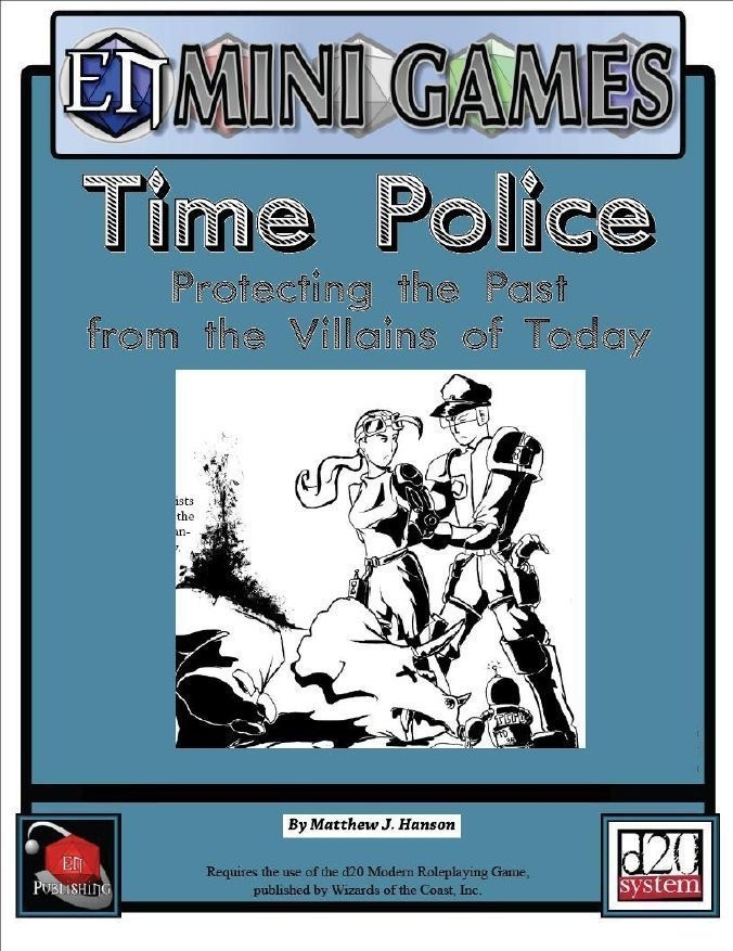 Time Police é um minijogo d20 projetado para permitir que você e seu grupo de jogadores tentem algo diferente para uma sessão rápida, com a opção de desenvolver uma campanha de longo prazo. A viagem no tempo é um dos elementos mais clássicos da ficção científica, e sua capacidade alucinante de misturar elementos anacrônicos na mesma história tem potencial para aventuras memoráveis. O crime no tempo é apenas a base para este minijogo, e nós encorajamos você a usar este livro para jogar todos os tipos de jogos de viagem no tempo.