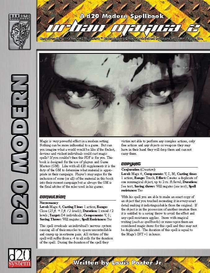Este PDF é a continuação do primeiro Urban Magica. Este livro de feitiços adiciona ainda mais novos feitiços para você usar nos jogos de sua vizinhança local. Os jogadores podem argumentar pela inclusão de parte (ou todo) do material deste livro em sua campanha atual, mas como sempre o mestre é o árbitro final de as regras usadas em seus jogos. Este PDF de quatro páginas é um produto fácil de integrar que abrange todos os novos feitiços para uso em qualquer grande mundo de campanha d20 Modern e sessão de jogo.