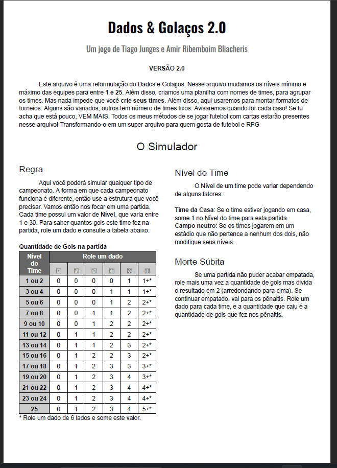 Está no ar o Dados e Golaços 2.0! Com uma planilha de times, novo sistema de níveis e diversos formatos de torneios, a sua criatividade futebolística é o limite agora! Entre os formatos presentes tem o bizarro "Escadinha" e o "Volta Ao Mundo" Aproveitem!
