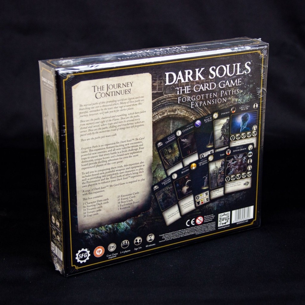 Forgotten Paths é uma expansão para Dark Souls: The Card Game. Esta expansão apresenta novos encontros empolgantes, novos e poderosos inimigos e novas regras para terreno e armadilhas para garantir que cada batalha seja um desafio novo. Quatro chefes exclusivos e um novo tabuleiro de exploração proporcionam uma aventura emocionante para os jogadores mais experientes do jogo principal.