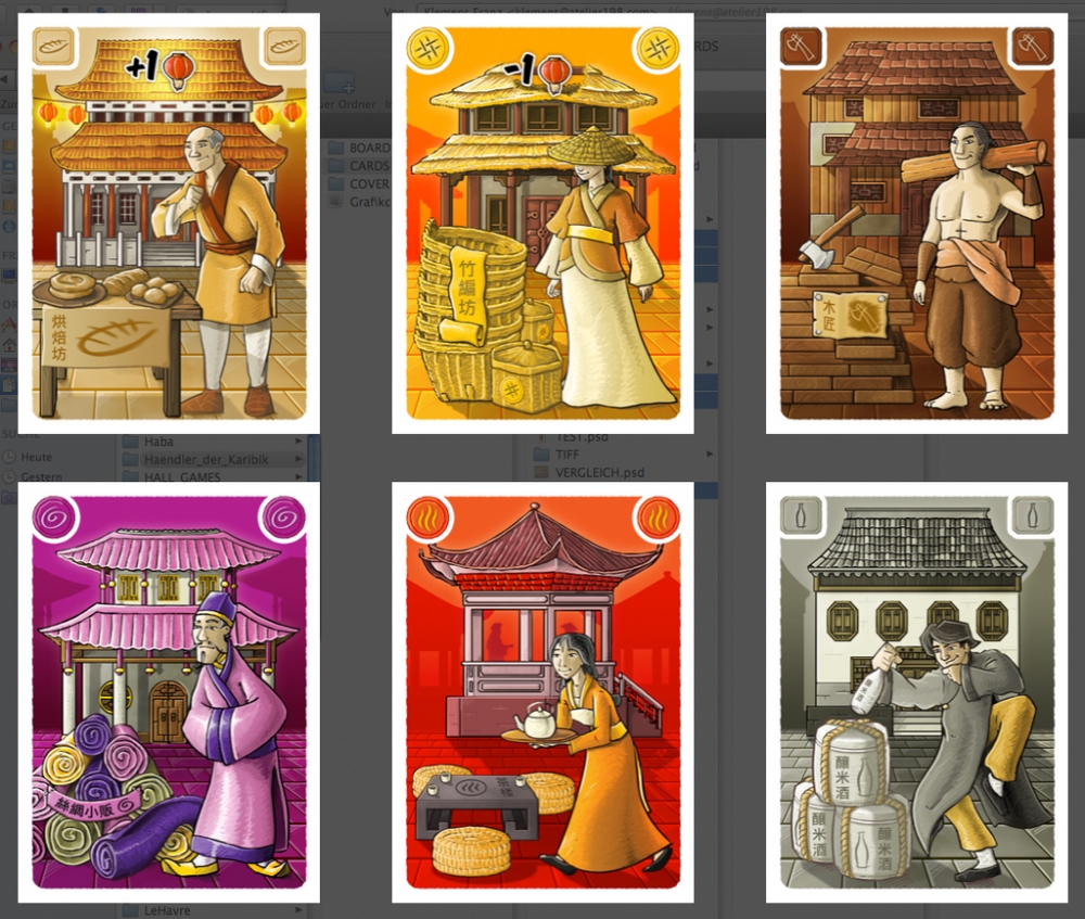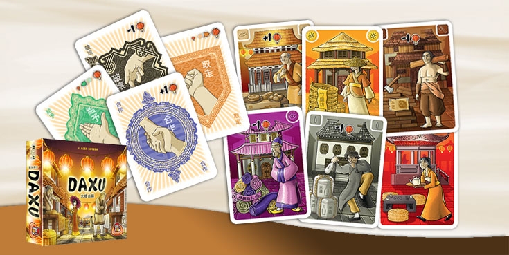 Em Daxu, os jogadores recolhem conjuntos de cartas de seis diferentes tipos de lojas: padaria, loja de vinho de arroz, madeireira, fabricante de cestas, comerciante de seda e casa de chá.