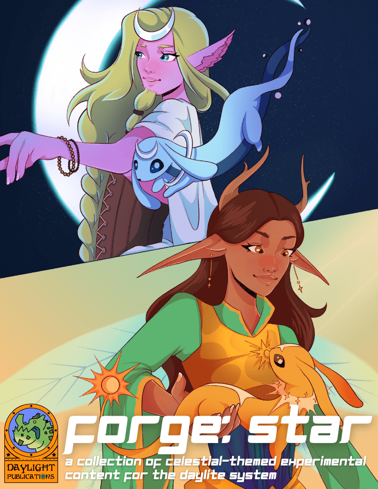 Seguindo a linha da nossa série Forge, Forge: Star pega uma capa que fizemos para um cenário potencial que acabou fracassando e a oferece como inspiração para escritores e artistas construírem e projetarem uma coleção de linhagens, carreiras, Grandes Seres e histórias temáticas em torno de corpos celestes. Esta pequena coleção maluca oferece alguns conceitos realmente empolgantes - como a história por trás dos Nebulings, aqueles carinhas na capa - ou o cavaleiro solheart, protetores divinos!
