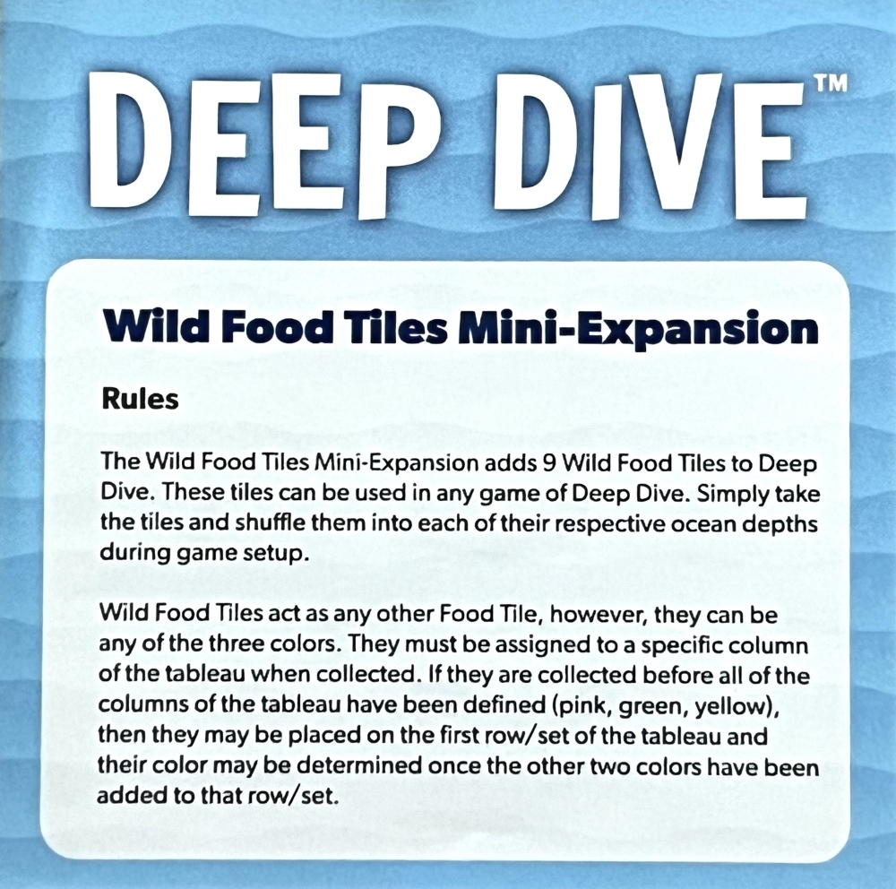 Deep Dive: Wild Food Tiles Mini-Expansion é um conjunto de blocos KS Promo incluídos nas promessas KS. Essas peças podem ser usadas em qualquer jogo, seja Deep Dive, embaralhando-as em suas respectivas profundezas durante a configuração. As peças selvagens agem como quaisquer outras peças, exceto que podem ter qualquer uma das três cores (atribuídas a uma coluna específica do quadro quando coletadas). Se coletadas antes de tudo, se as colunas do quadro tiverem sido definidas, elas deverão ser colocadas na primeira linha/conjunto do quadro e sua cor determinada assim que as outras duas cores forem adicionadas a essa linha/conjunto.
