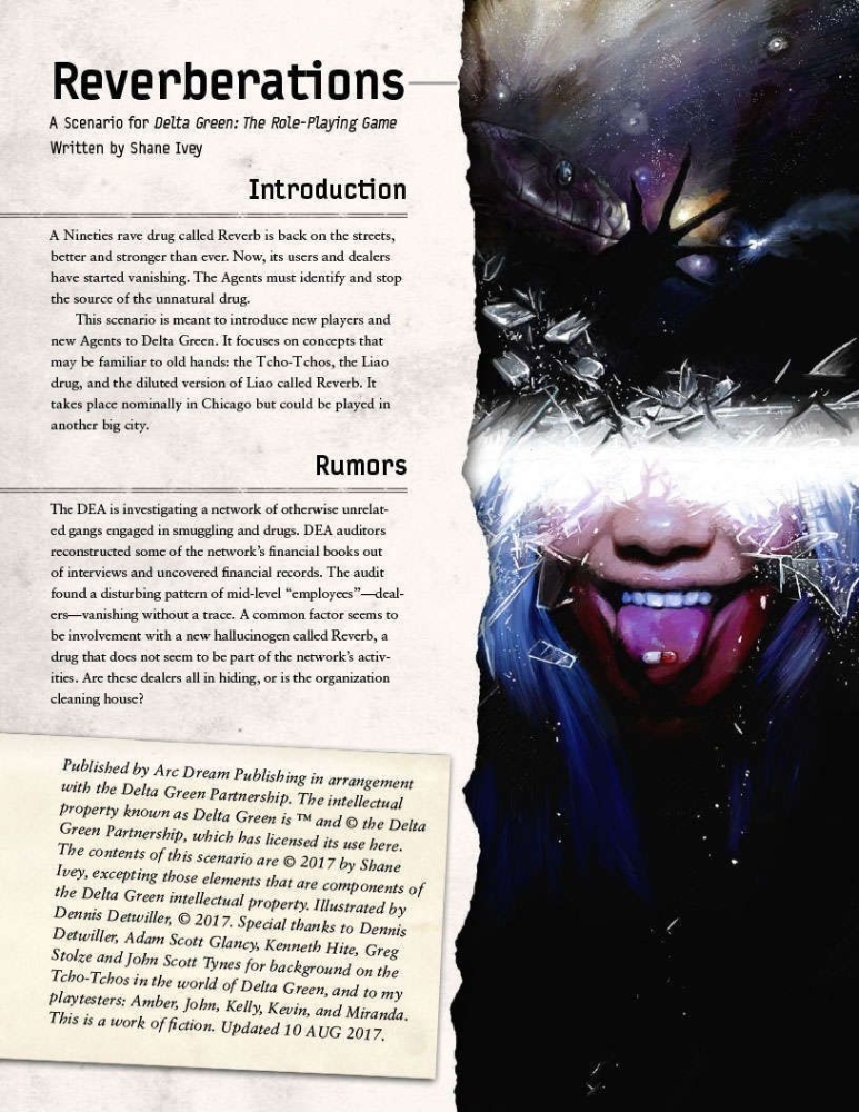 Este cenário tem como objetivo apresentar novos jogadores e novos Agentes ao Delta Green. Ele se concentra em conceitos que podem ser familiares aos veteranos: o Tcho-Tchos, a droga Liao e a versão diluída de Liao chamada Reverb. Acontece nominalmente em Chicago, mas poderia ser disputado em outra cidade grande.