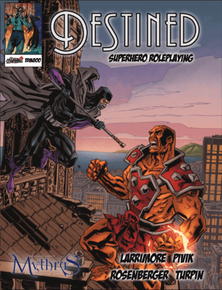 Baseado nas aclamadas regras de Mythras, Destined é um sistema de jogo fácil de aprender e cheio de ação. Destined lhe dá todas as regras que você precisa para criar as histórias de super-heróis que você quer contar. De quatro contos coloridos de spandex e capas, a histórias corajosas de crimes do mundo real, Destined permite que você jogue como qualquer super-herói (ou vilão) que você queira ser.