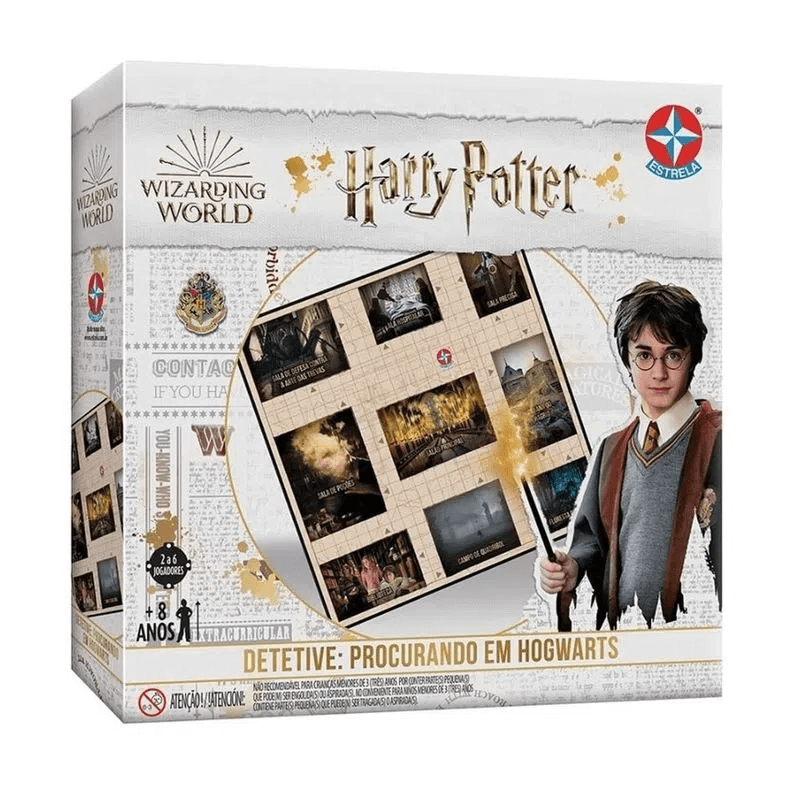 Jogo Detetive com temática Harry Potter, onde cada detetive deve descobrir um desaparecimento nos locais de Hogwarts, usando as armas q são os feitiços e poções, e os personagens principais são os suspeitos, mais um jogo da franquia do bruxo que conquistou o Mundo dos trouxas.