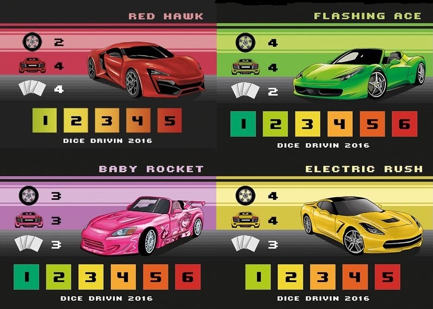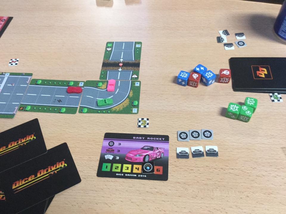 Dice Drivin 'é um pequeno jogo de corrida, com uma pista composta de cartas. Para avançar no caminho, os jogadores jogam dados personalizados, escolhendo (sabiamente) quantos e quais tipos de dados, com todas as cartas de pista tendo necessidades diferentes que devem ser cumpridas a fim de avançar. Os jogadores também têm cartas de ação para usar em momentos oportunos.